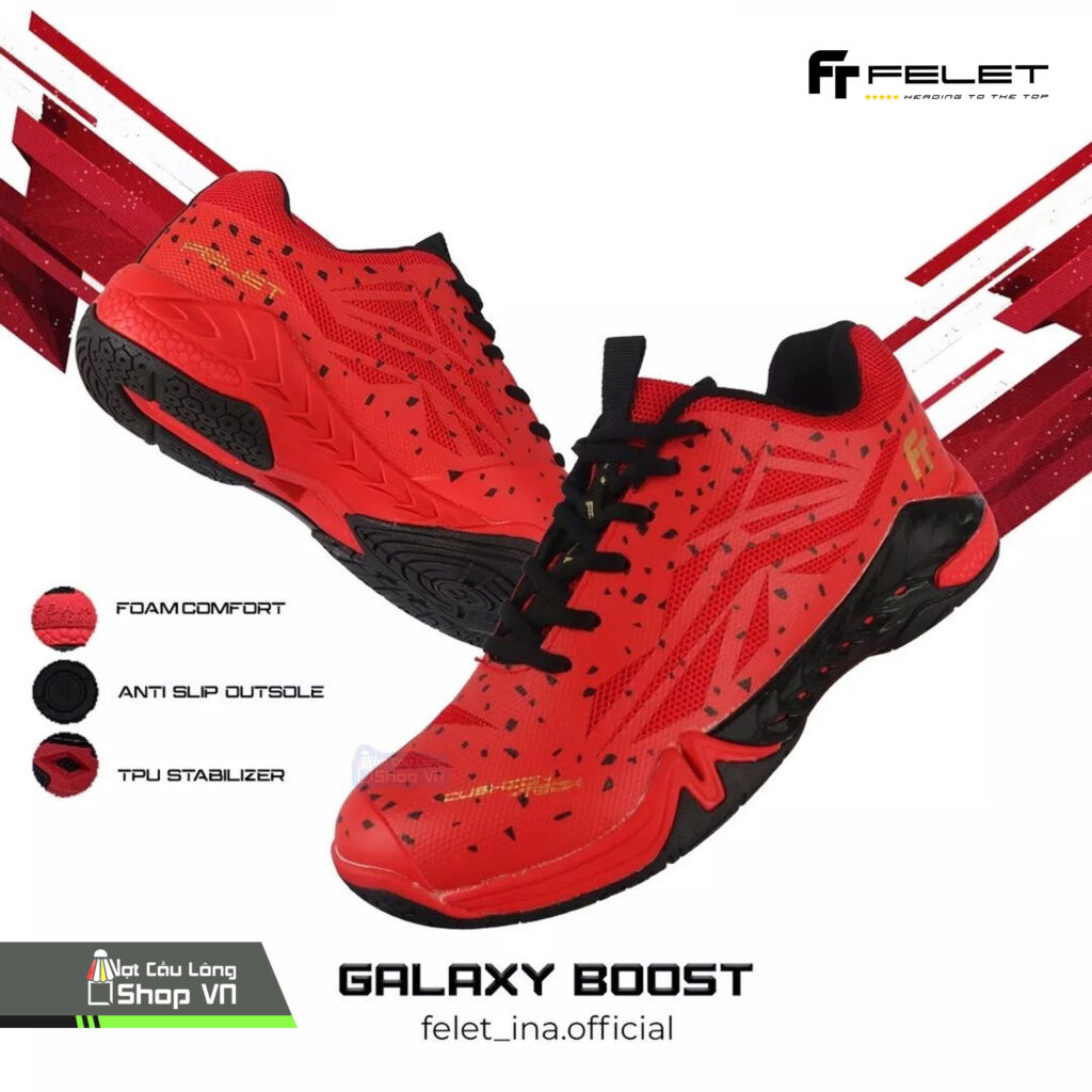 0899 163 666Vợt Cầu Lông Shop xin giới thiệu đến các bạn một mẫu sản phẩm rất hot mới về hàng tại shop, đó chính là Giày cầu lông Felet Galaxy Boost Đỏ Đen sản phẩm vừa được ra mắt bởi thương hiệu Felet với màu sắc đa dạng, chất lượng bền bỉ và giá thành phù hợp được đánh giá là một mẫu giày nhận được nhiều phản hồi tích cực nhất đến từ người tiêu dùng. Phiên bản mới nhất của giày cầu lông Felet Galaxy Boost đã chính thức ra mắt trong thời gian gần đây và nhanh chóng trở thành một trong những mẫu giày cực hot nhờ thiết kế hoàn toàn mới, độc đáo và bắt mắt, hoàn hảo cho xu hướng thời trang hiện nay.