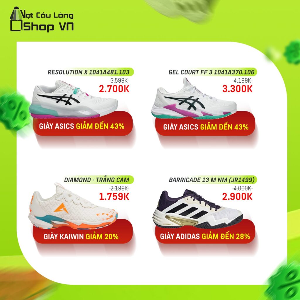 - Giày thể thao chính hãng từ các thương hiệu Kaiwin, Asics, Adidas được giảm giá mạnh, mức ưu đãi lên đến 43%: