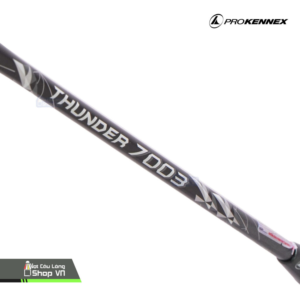 Vợt Prokennex Thunder 7003 Xám đen có trọng lượng chỉ 4U, thân vợt thon gọn và dẻo vừa giúp người chơi dễ dàng điều chỉnh góc đánh và độ chính xác.